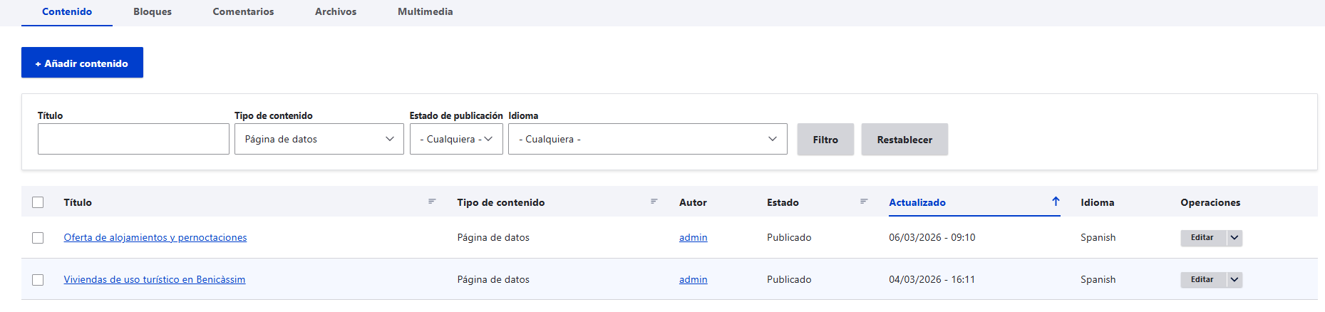 Contenido > Filtrar por tipo de contenido "Página de datos" > Pulsar Filtro